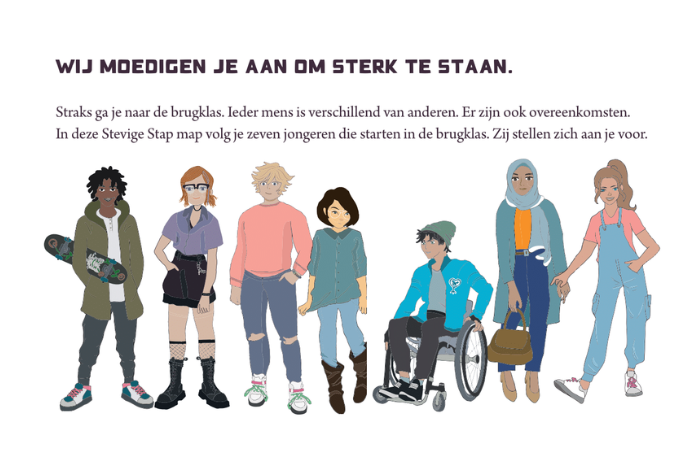 Tijdens de training wordt gebruik gemaakt van een professioneel Stevige Stap werkboek waarin de leerlingen kennis maken met 7 rolmodellen die ook de overstap gaan maken naar de brugklas. Deze jongeren maken situaties mee die veel brugklassers zullen herkennen: